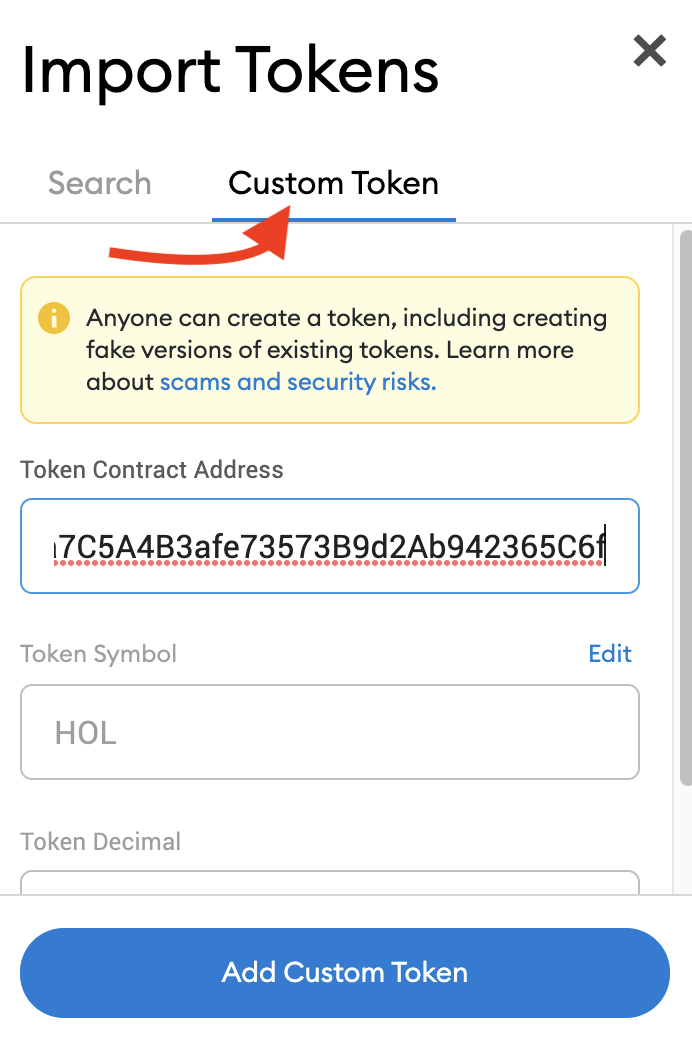 Depending on your wallet you may need to manually add the HOL token. This is a common source of panic â until you add the token to your wallet you wonât be able to see it! Donât be worried though: the tokens are there, we just need to make them appear.
