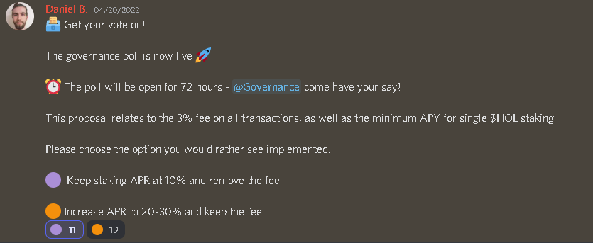 Our first poll, which asked about transaction fees and the staking APR, closed with a total of 30 votes. While this isn’t the entire community, we felt it was a good point to begin from, and we expect that subsequent votes will receive even more engagement from our community.