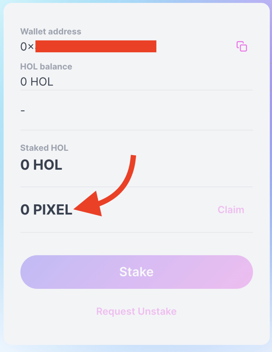 Rewards are paid at a rate of 1 $PIXEL for every 1 $HOL staked per day. For example, if you stake 100 $HOL, you’ll earn 100 $PIXEL every 24 hours.