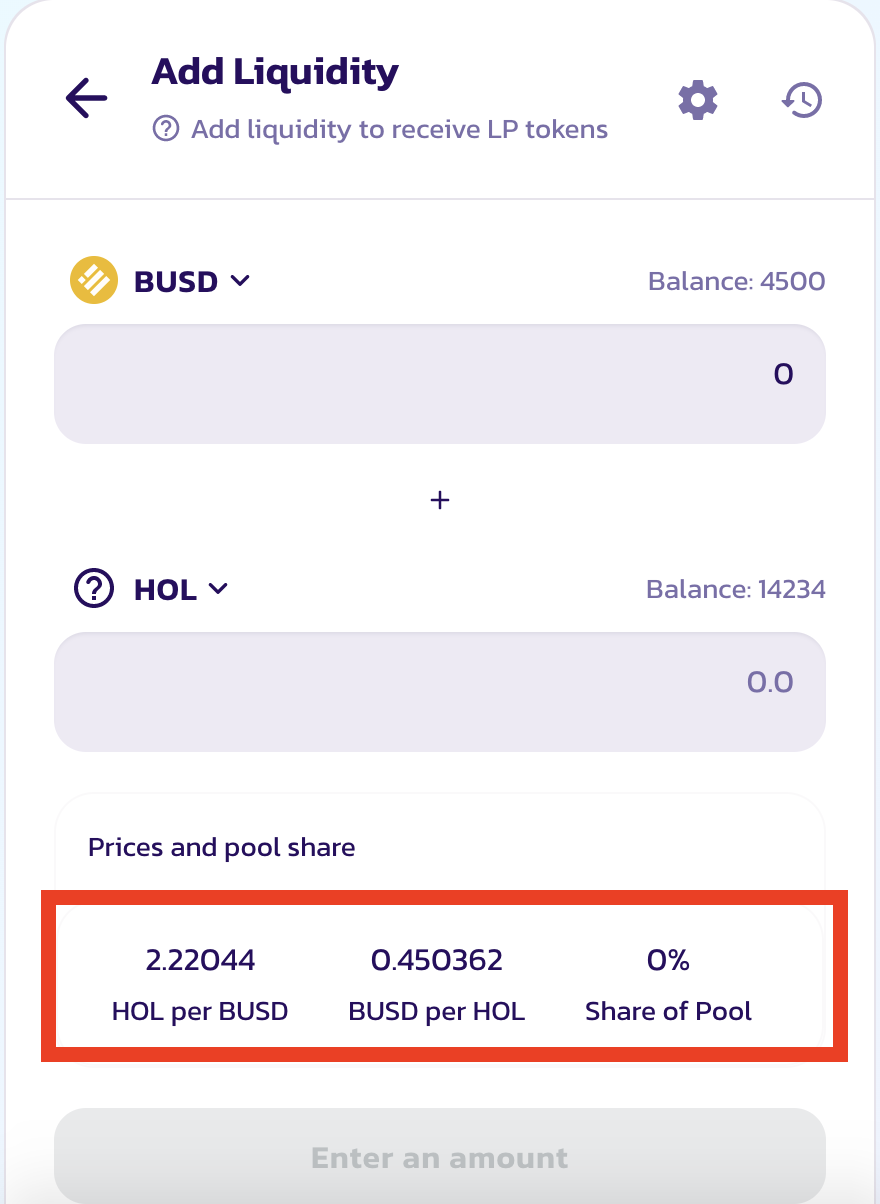 Now, decide how much liquidity you want to add. It’s important to remember you need to add assets in a 1:1 ratio — for every $1 in BUSD, you need to add $1 worth of $HOL. PancakeSwap uses the up-to-date token price to calculate the ratio, which is shown at the bottom of the box.
