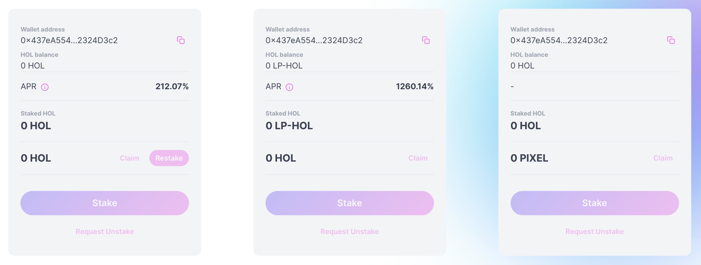 Staking in this pool follows the same procedure as the first single-asset $HOL pool. Please read that section for the step-by-step on what you need to do to farm $PIXEL.