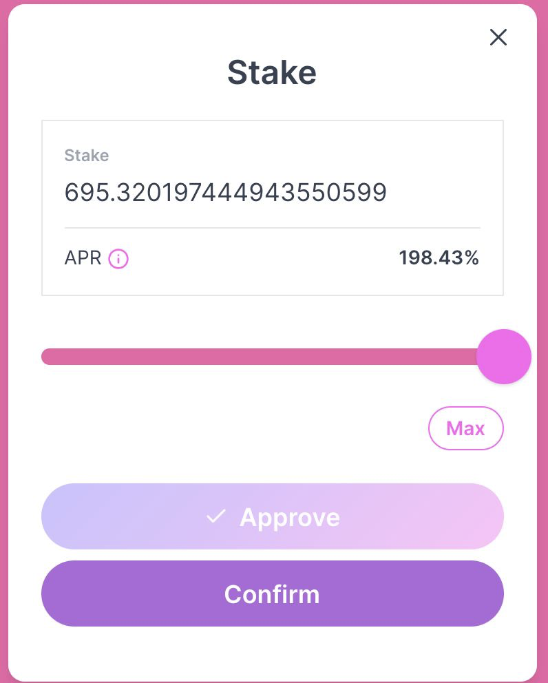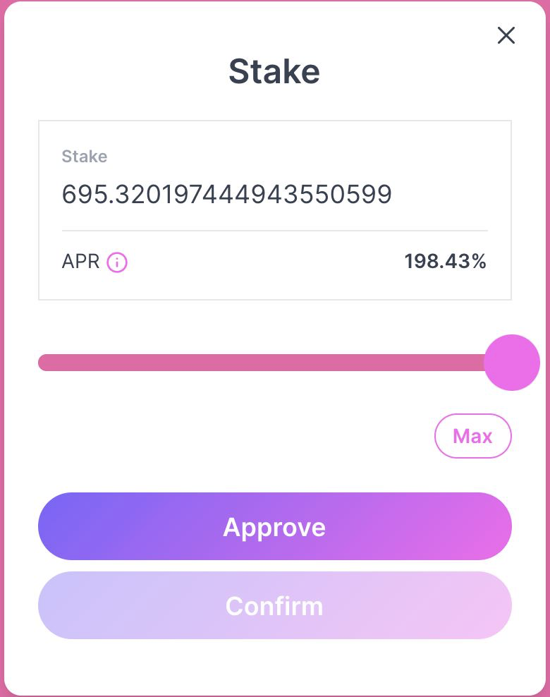 Here you’ll follow the same process as single-asset staking, but with LP tokens instead. You can tell it’s the LP token pool by the staked asset description. The APR on these pools will also generally be higher than other pools.