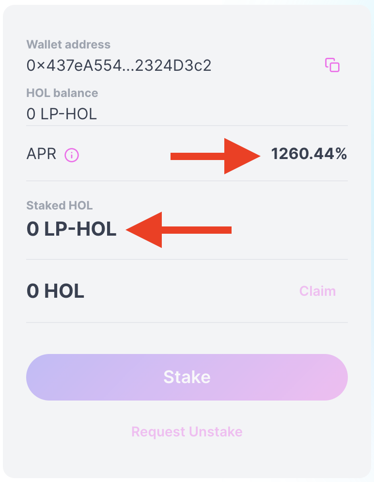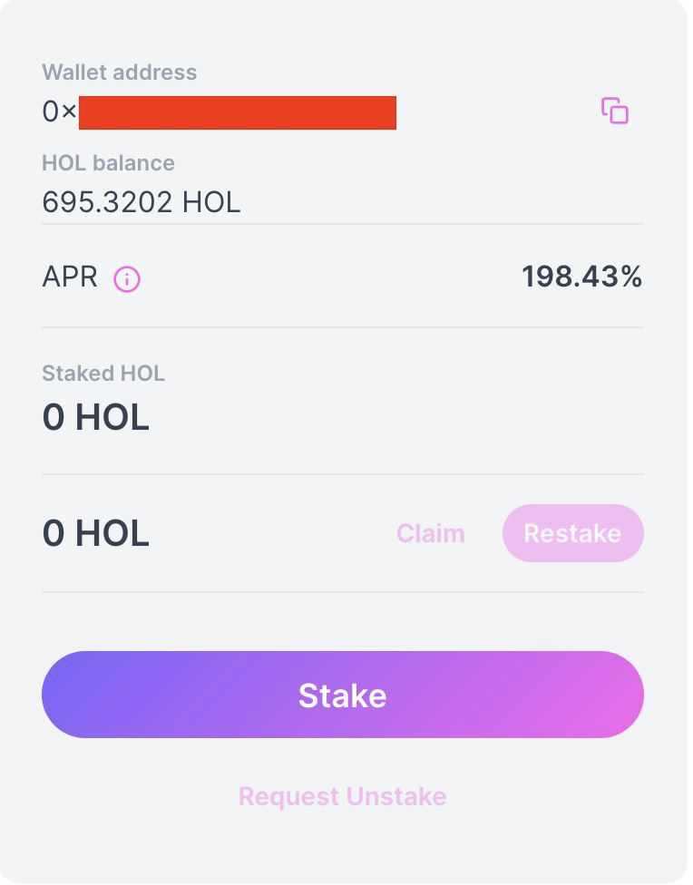 For now, let’s stake in this pool. Click ‘Stake’ and choose how much $HOL you’d like to stake.
