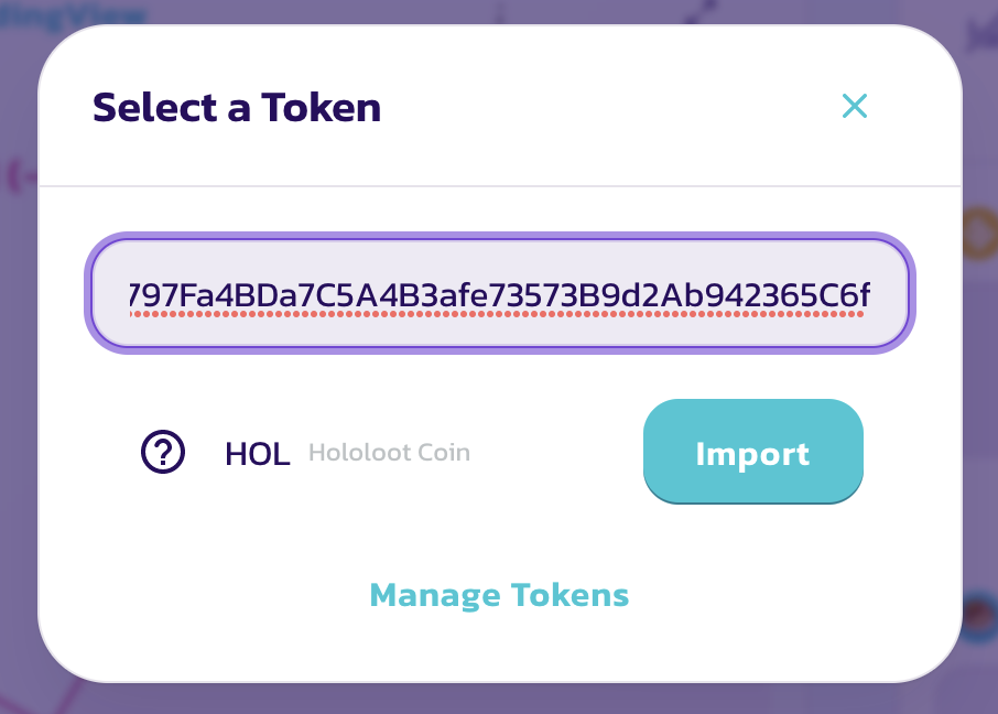 On the second asset, paste the Hololoot contract address into the search box. Itâll prompt you to import the token.